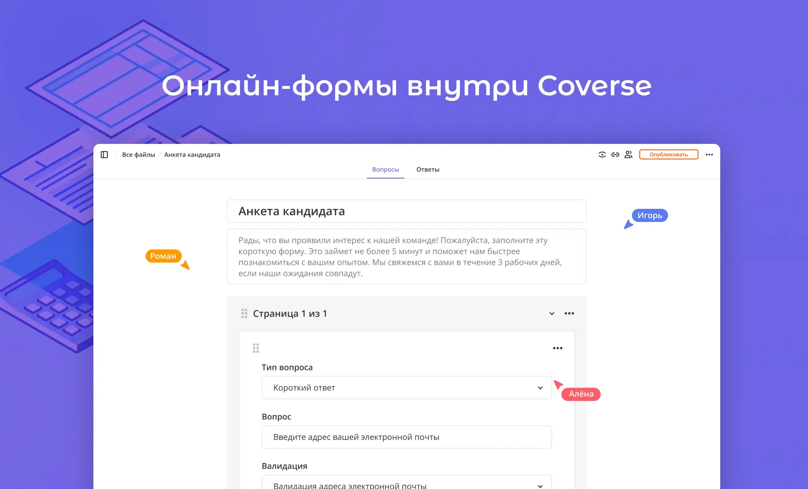Теперь вам не нужно использовать сторонние сервисы (Google Forms, Яндекс формы и др.) для сбора информации. Создавайте формы прямо в Coverse, и ответы будут автоматически попадать в ваши рабочие таблицы.